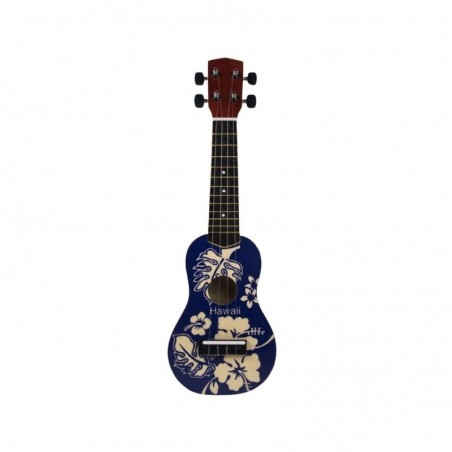 Flame UK 04 Ukulele soprano, de culoare albastru cu imprimeu hawaian.
