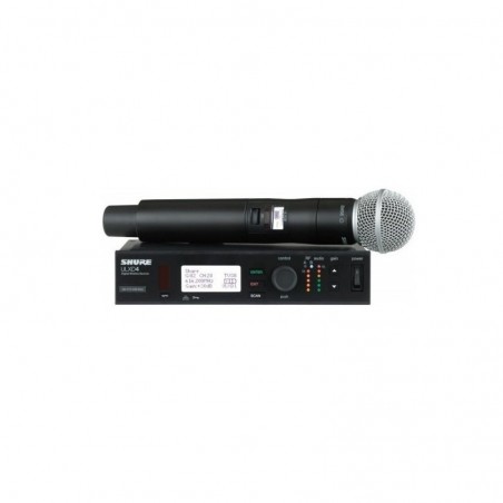 Sistem wireless Shure ULXD24/SM58 K51 format din: transmițător de mână cu capsulă de microfon SM58 și receptor digital wireless, ce oferă o claritate audio fără compromisuri pe 24 de biți și o performanță RF extrem de eficientă