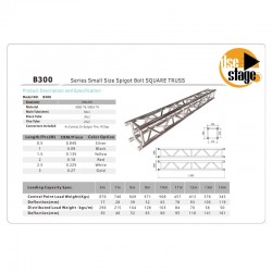DSE Stage B34100, truss quad-tubular, lungime 1 metru, latime de 300*300mm, compusa din 4 tevi aluminiu, (4 laturi) cu zabrele de aluminiu. La fiecare 0.5m schela are inca o latura de sustinere si de stabilitate si 2 tuburi laterale/zabrele. Tubulatura principala este confectionata din Aluminiu 6082-T6 de inalta rezistenta 50mm * 3mm, latura de sustinere din aluminiu 30mm*2mm. Zabrelele cu dimensiunea de 25mm * 2mm
