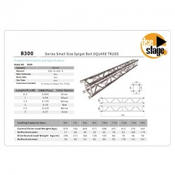 DSE Stage B34150, truss quad-tubular, lungime 1.5 metri, latime de 300*300mm, compusa din 4 tevi aluminiu, (4 laturi) cu zabrele de aluminiu. La fiecare 0.5m schela are inca o latura de sustinere si de stabilitate si 2 tuburi laterale/zabrele. Tubulatura principala este confectionata din Aluminiu 6082-T6 de inalta rezistenta 50mm * 3mm, latura de sustinere din aluminiu 30mm*2mm. Zabrelele cu dimensiunea de 25mm * 2mm