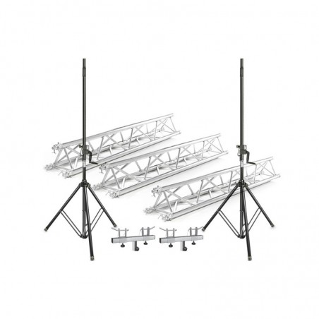 Set schela pentru lumini, formata din 2 stative cu scripete, 2 adaptoare pentru schela si 3 traverse de aluminiu de 2m. Solutia completa pentru trupe sau dj care vor sa foloseasca fie cortine led, fie lumini.
