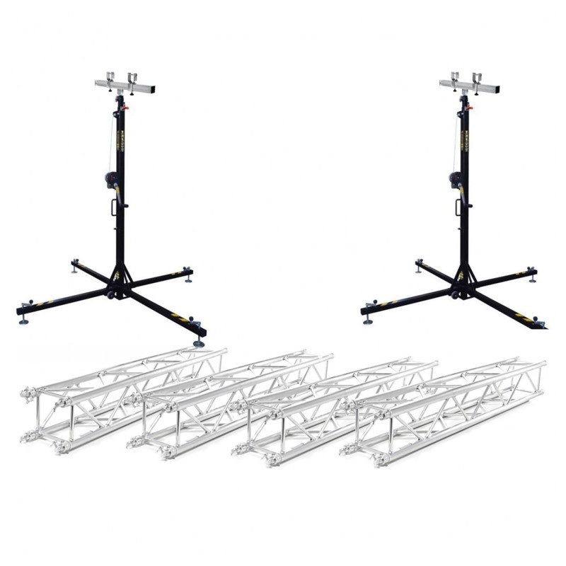 Set schela pentru lumini, formata din 2 stative cu scripete Fantek T102, 2 adaptoare pentru schela si 4 traverse de aluminiu de 2m. Solutia completa pentru trupe sau dj care vor sa foloseasca fie cortine led, fie lumini, etc.