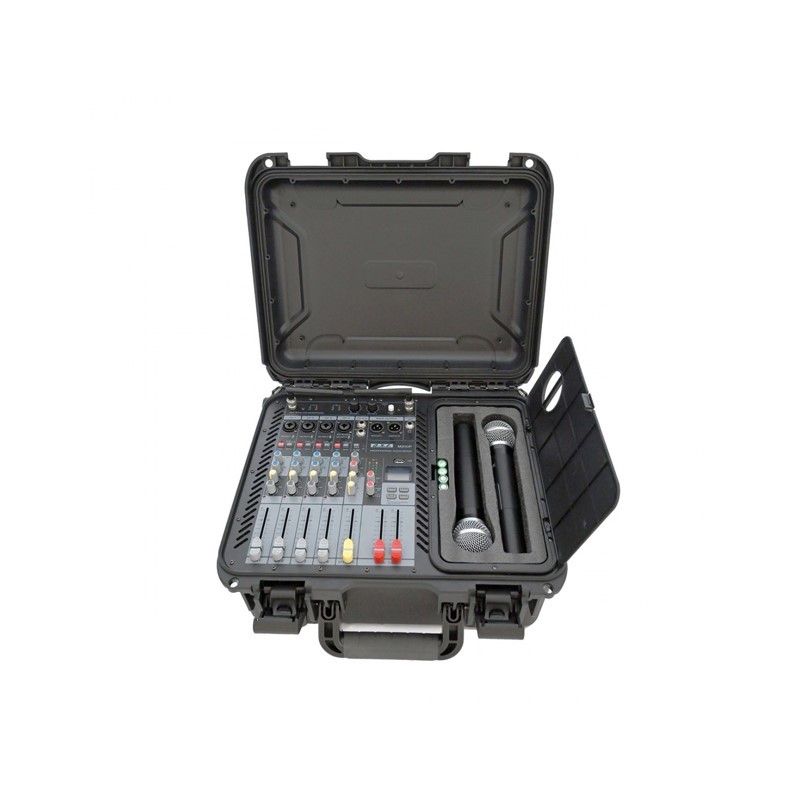 Deasupra secțiunii mixerului este un modul receptor de microfon dublu UHF pentru perechea de microfoane wireless portabile furnizate, care sunt depozitate ordonat într-un compartiment separat lângă secțiunea mixerului.