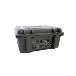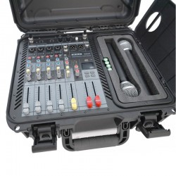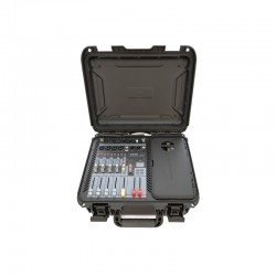 Amplificator PA de 2 x 300 W complet autonom, cu un mixer complet integrat într-o carcasă tip case foarte rezistentă, cu două dispozitive de blocare și un mâner de transport robust. Deschiderea capacului dezvăluie o secțiune de mixer cu 4 canale cu o intrare stereo suplimentară și alte comenzi individuale de volum pentru playerul audio USB intern și receptorul Bluetooth.