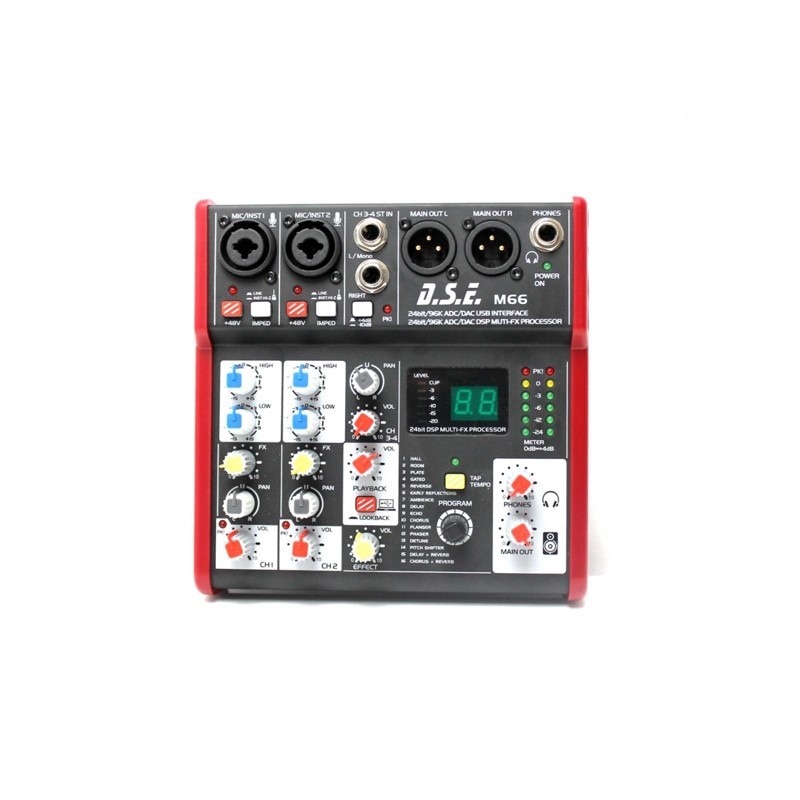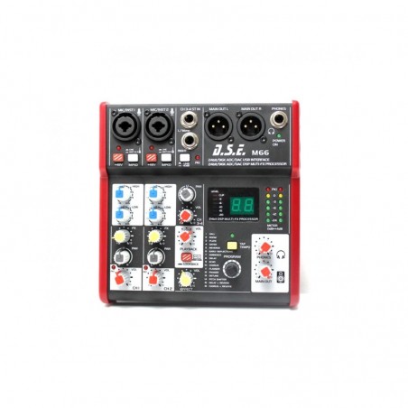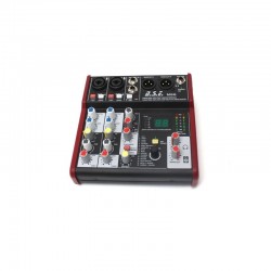 Mixer audio compact (interfata audio) cu 3 canale de intrare, iesire L/R XLR, iesire separata pentru casti, EQ pe 2 benzi, procesor de efecte multi-FX pe 24biti, interfata USB 2.0. Phantom power +48V pe canalele de microfon.