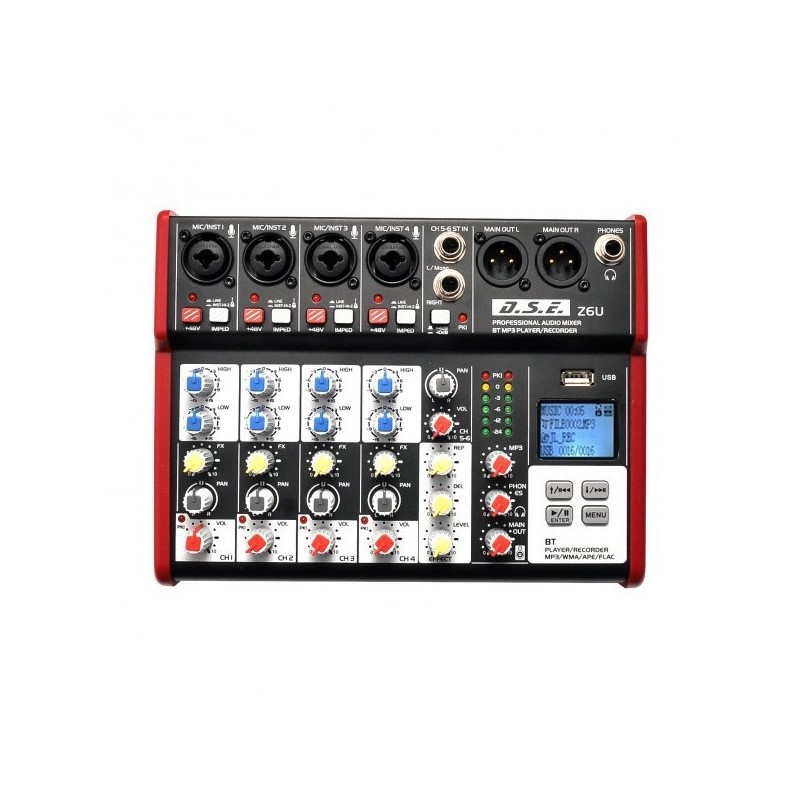 Mixer pasiv DSE Z6u, cu 4 canale mic/line (cu compresor si phantom power +48V), 1 canal stereo, interfata audio USB 24-bit, 49 Khz, redare audio prin USB si Bluetooth. Procesor de efecte. Iesire stereo XLR. Inregistrarea se face direct pe USB.
